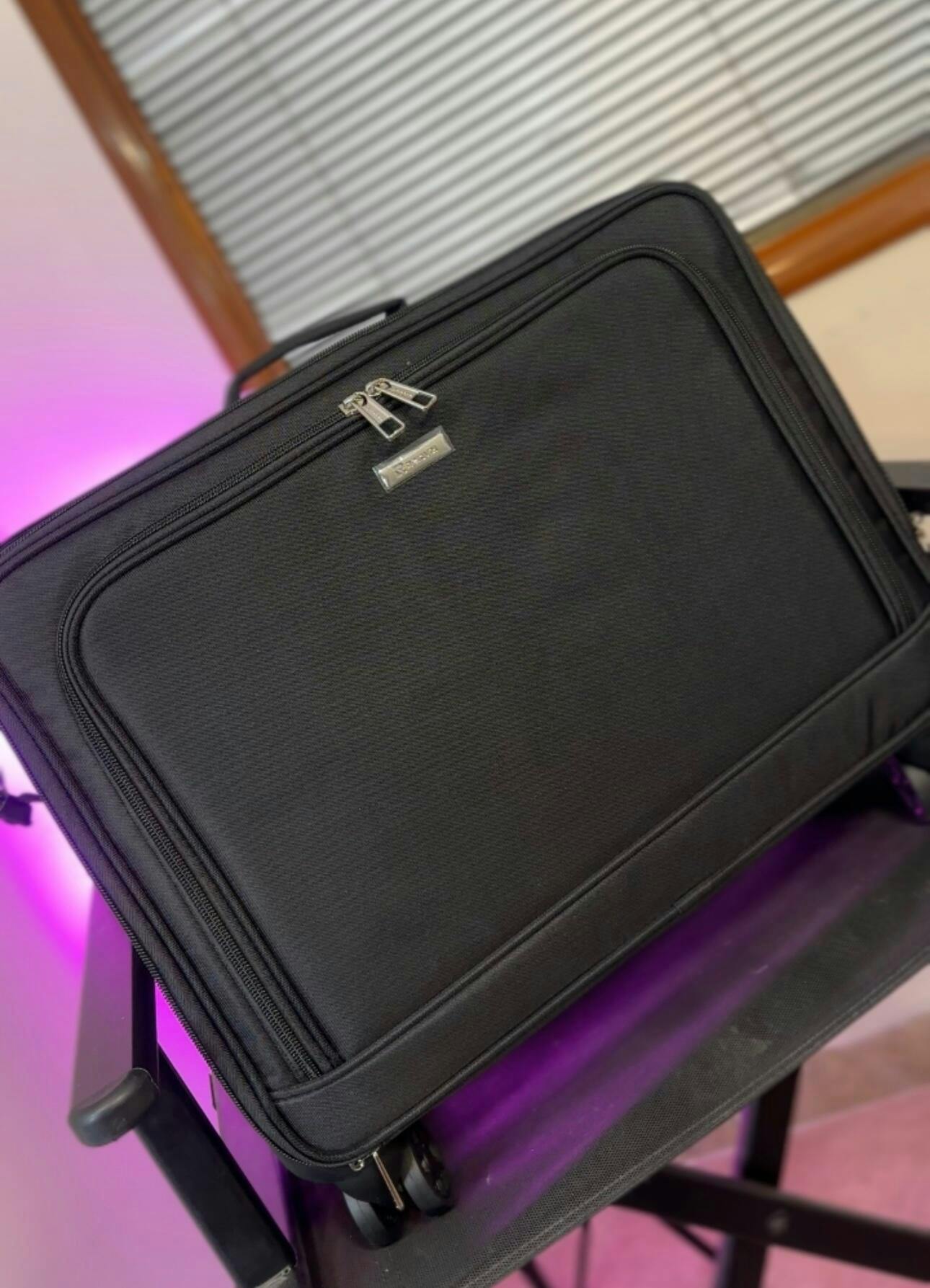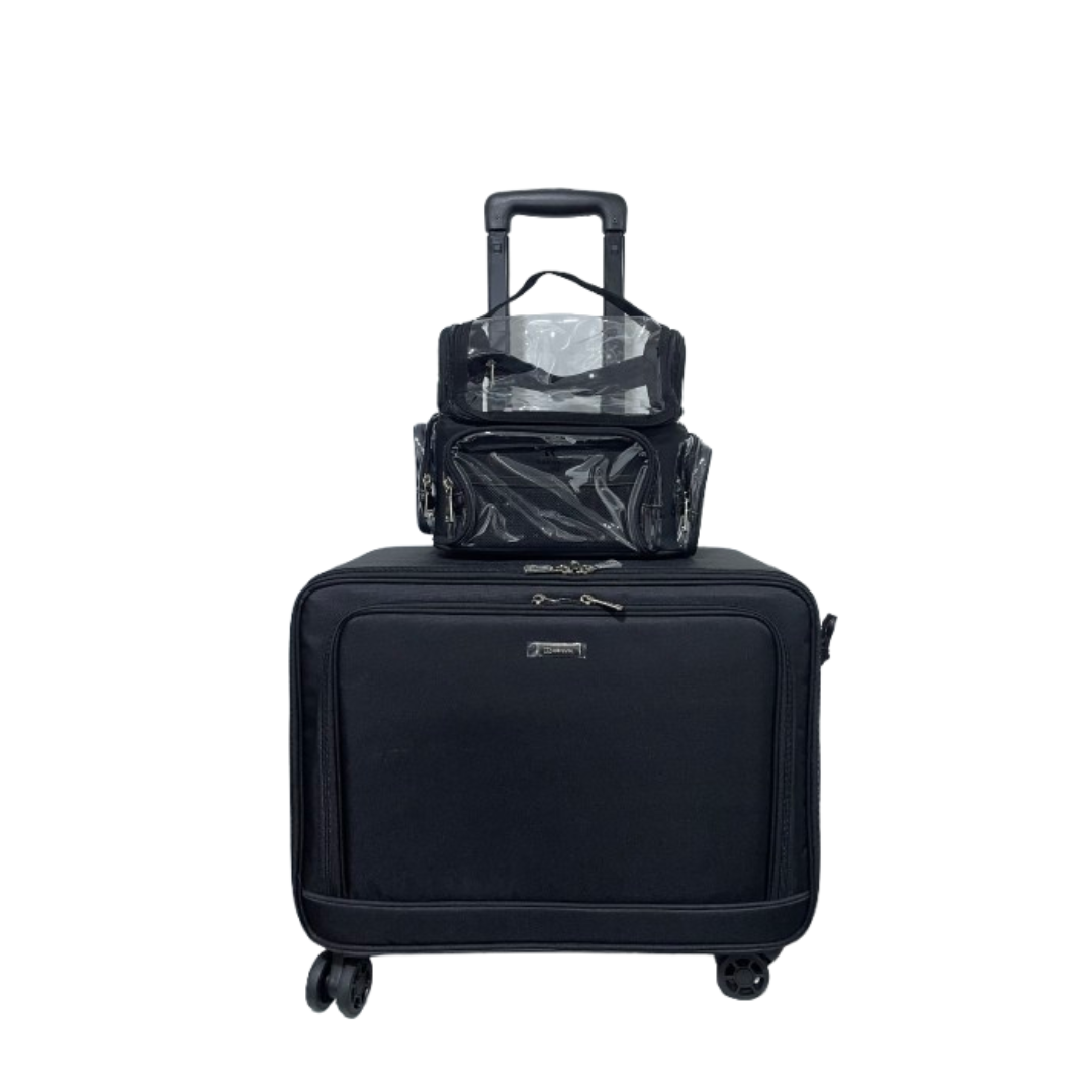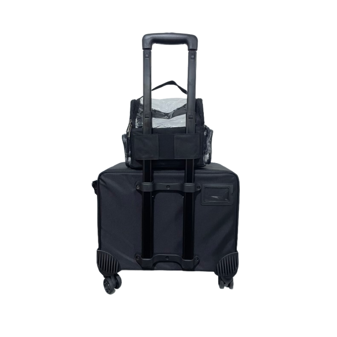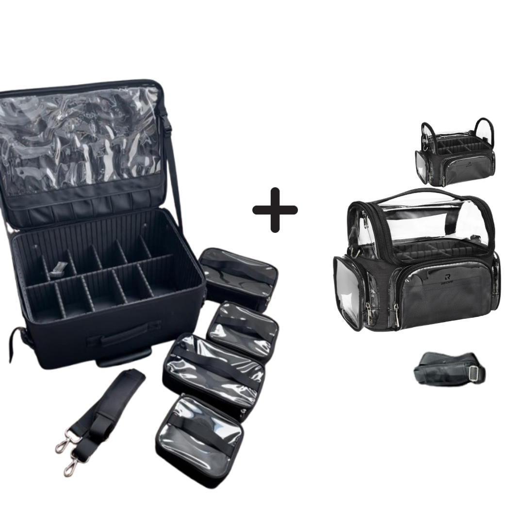 Parte Inferior: Maleta de doble compartimiento con ruedas giro 360 grados de la marca Relavel. Elaborado en lona oxford de alta calidad para mayor duración y resistencia. Facil de limpiar. El primer compartimiento cuenta con bolsillo térmico para guardar herramientas calientes o frías. El segundo compartimiento cuenta con 2 estuches pequeños y 2 estuches grandes, un brochero amplio y separadores regulables. Cuenta con correa.
