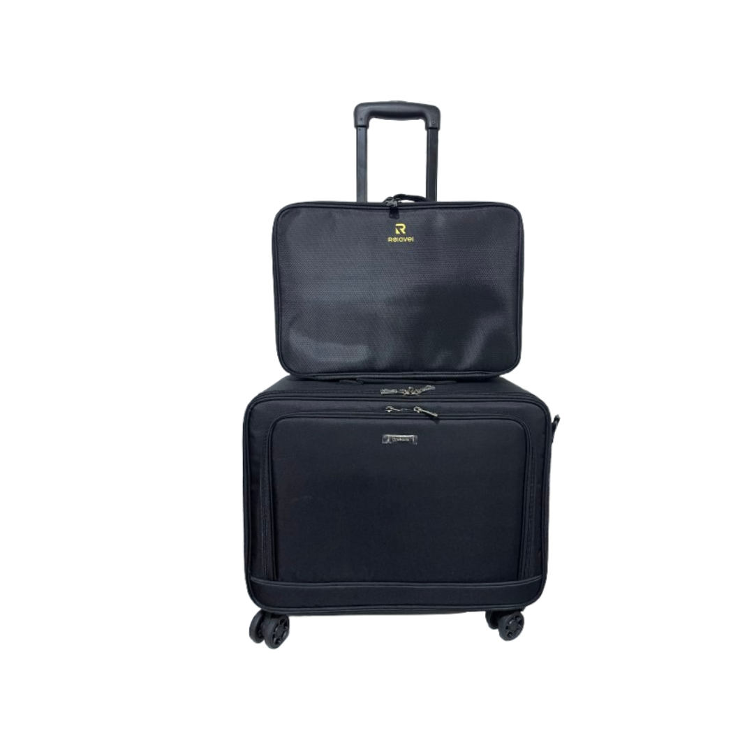 Parte Inferior: Maleta de doble compartimiento con ruedas giro 360 grados de la marca Relavel. Elaborado en lona oxford de alta calidad para mayor duración y resistencia. Fácil de limpiar. El primer compartimiento cuenta con bolsillo térmico para guardar herramientas calientes o frías. El segundo compartimiento cuenta con 2 estuches pequeños y 2 estuches grandes, un brochero amplio y separadores regulables. Cuenta con correa.